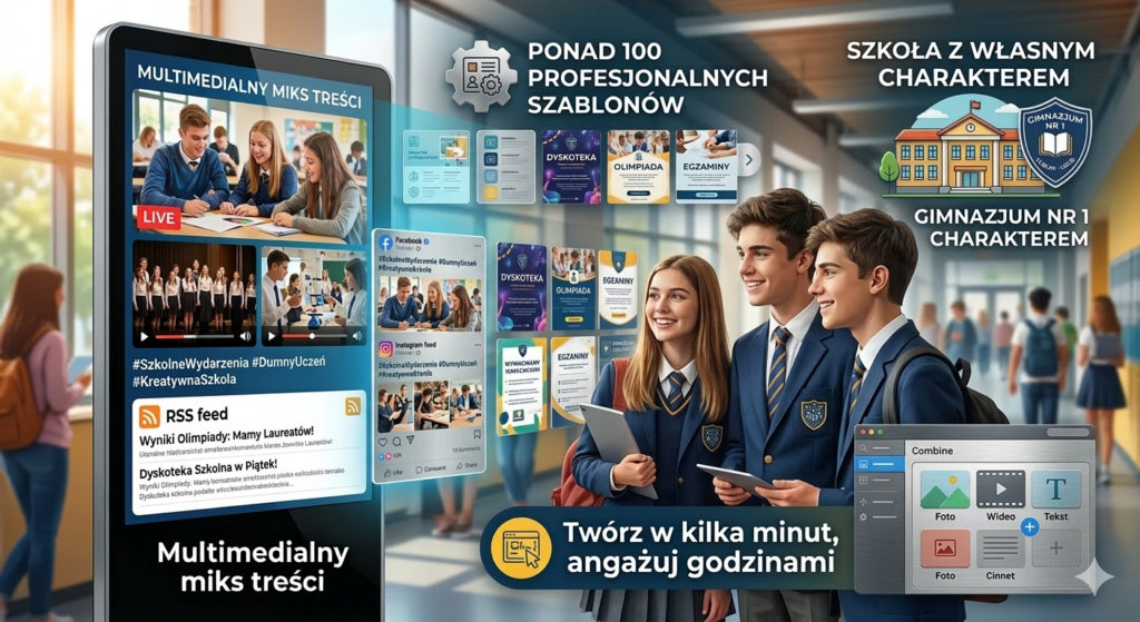 Multimedialny miks: Łącz zdjęcia, filmy z akademii, social media i kanały RSS w jeden dynamiczny przekaz.